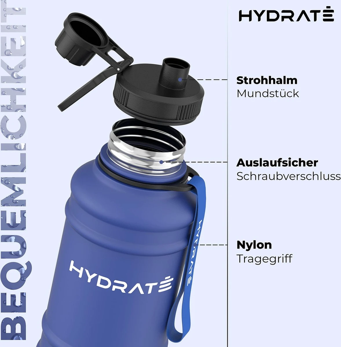 HYDRATE Roestvrij Stalen Waterfles – 1,3 Liter Waterfles – BPA-vrije Sportfles – Metalen Waterfles Praktische Nylon Draagband En Lekvrije Schroefdop, Sportdrinkflessen