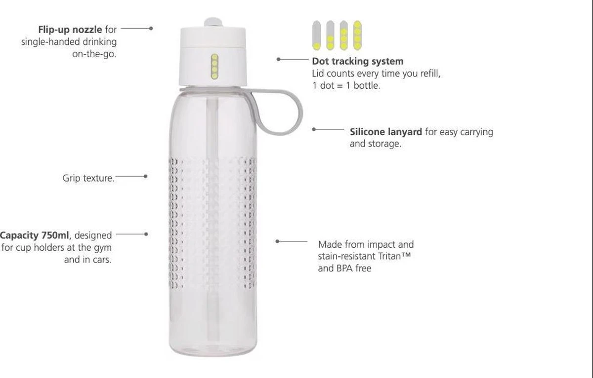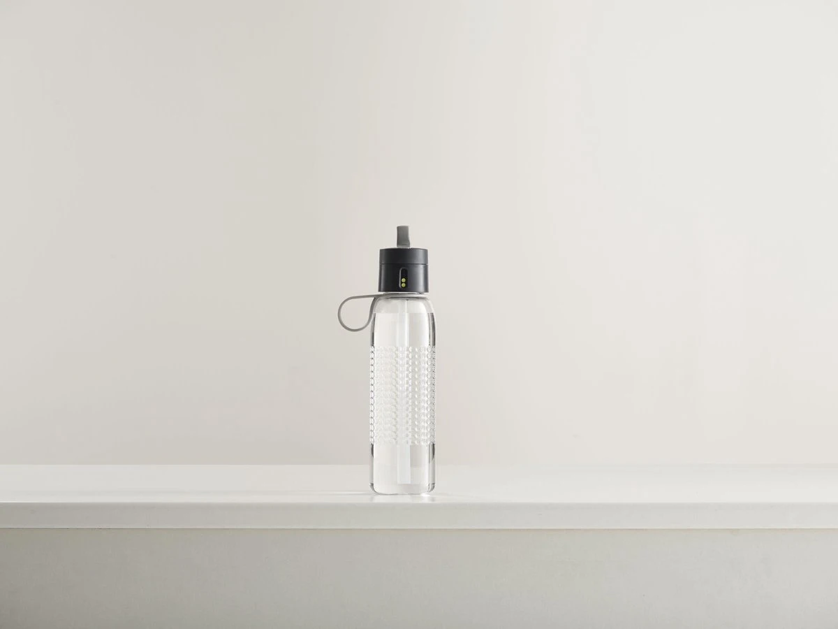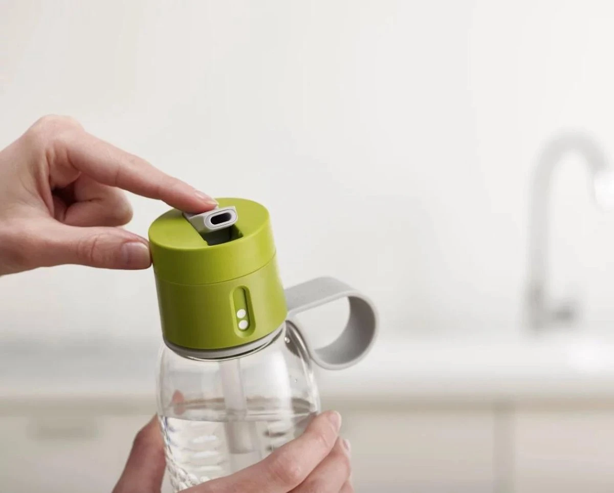 Dit ontwerp is voorzien van een slim deksel waaraan je een klik kunt geven bij het sluiten van de deksel zodra je je fles weer gevuld hebt. Zo kun je bijhouden hoeveel je reeds gedronken heeft. De waterfles kan maximaal tot 4 stippen per dag.