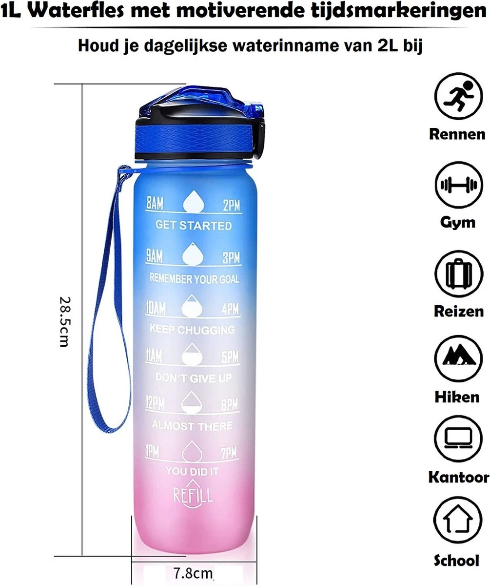 We weten allemaal dat water drinken gezond is maar, toch drinken we gedurende de dag niet voldoende water. Wil je meer water drinken maar vind je het lastig om daaraan te houden? Laat je motiveren door water te drinken uit de juiste waterflessen! Met deze waterfles hoef je nooit bang te zijn dat je niet genoeg water drinkt. De motivatieflessen zorgen ervoor dat je elke uur genoeg water drinkt. Dankzij een handige tijdmarkering, kun je altijd jouw vochtinname bijhouden. Hierdoor drink je altijd 2 liter water per dag.