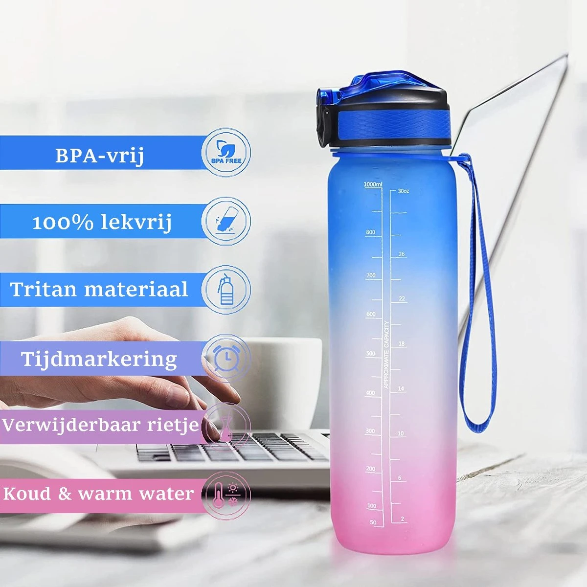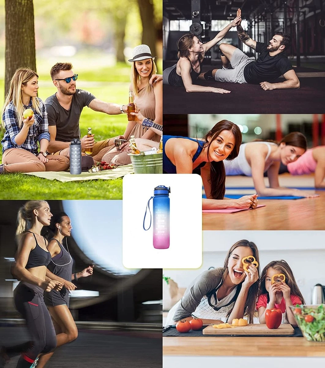 Met uniek inspirerend citaat en tijdmarkering is deze waterfles zeer geschikt voor het meten van je dagelijkse waterverbruik. Het herinnert je eraan om de hele dag door gehydrateerd te blijven. De tijdsmarkering helpt je om de werkelijke hoeveelheid watertoevoer eenvoudig en duidelijk te controleren. De brede opening is gemakkelijk om ijsblokjes te vullen en te reinigen.