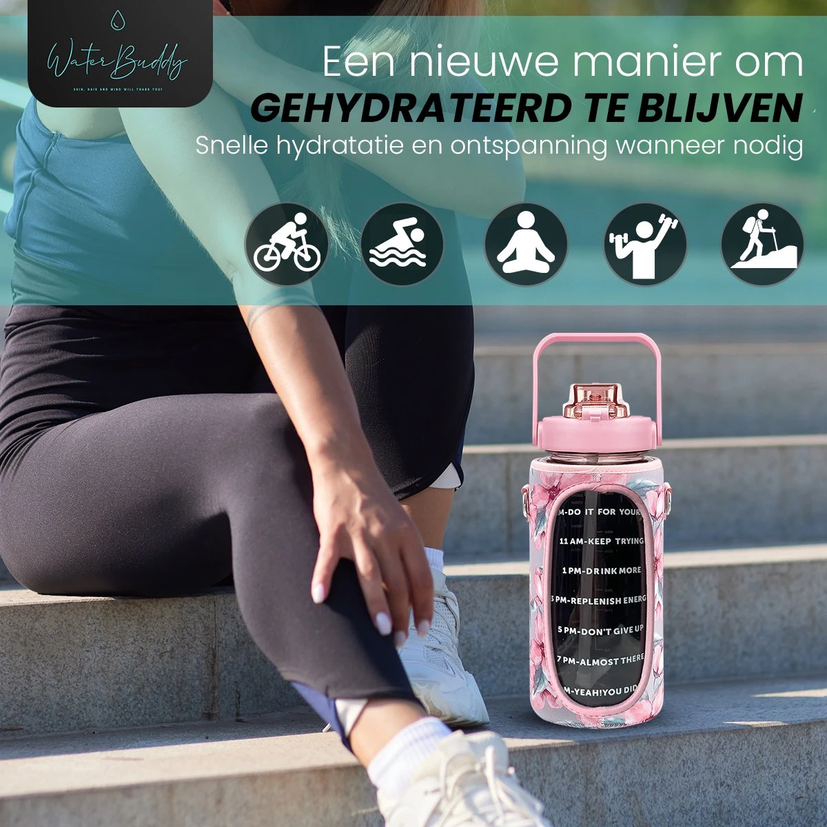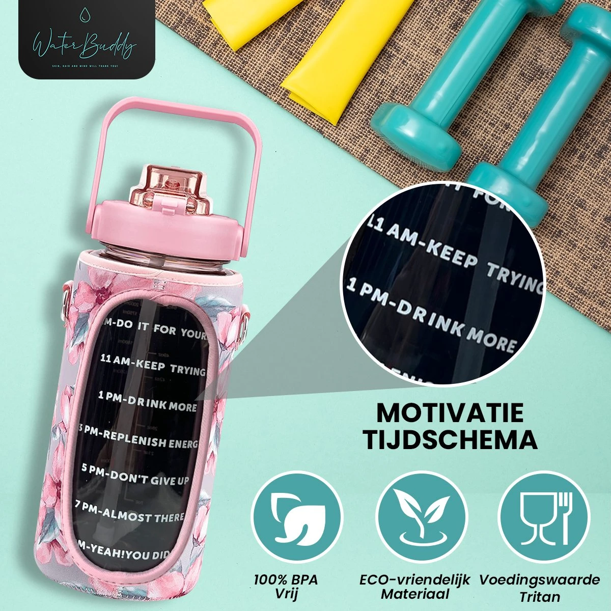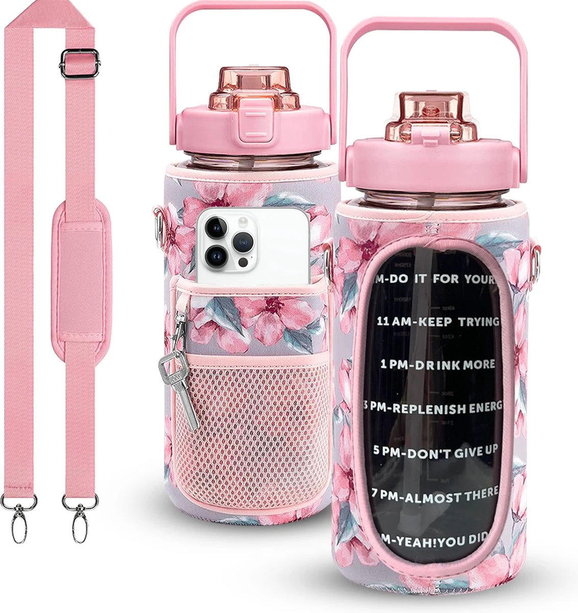 Onze 2 liter drinkfles met bijpassende sleeve! Neem je drinken nu nog makkelijker overal mee naar toe samen met je allerbelangrijkste items.