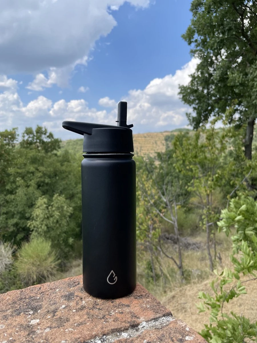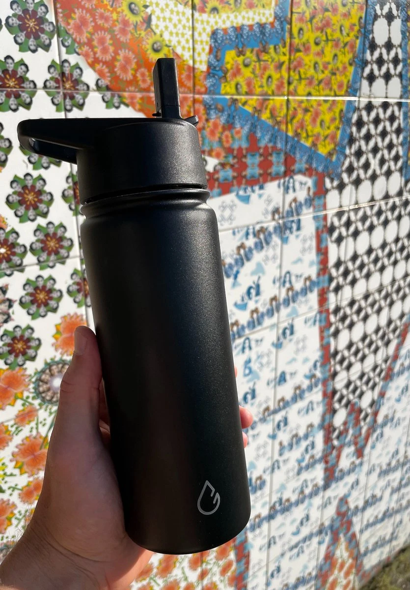 Een mooie mat zwarte fles met een subtiel logo die je overal makkelijk mee naartoe neemt. De capaciteit is 530 ml waardoor hij niet veel ruimte in je tas inneemt als je een dagje op stap bent of bijvoorbeeld naar kantoor of school gaat. Houd hem vast bij het lipje van de draaidop of hendel van de dop met rietje en je neemt hem ook makkelijk in je hand mee. De brede opening zorgt ervoor dat alle ijsblokjes erin passen, maar dat je hem ook eenvoudig schoonmaakt en weer bijvult met water of een ander drankje. Bij de waterfles zitten twee doppen. Een isolerende draaidop en een dop met een rietje zodat je voor in elke situatie de juiste fles hebt.